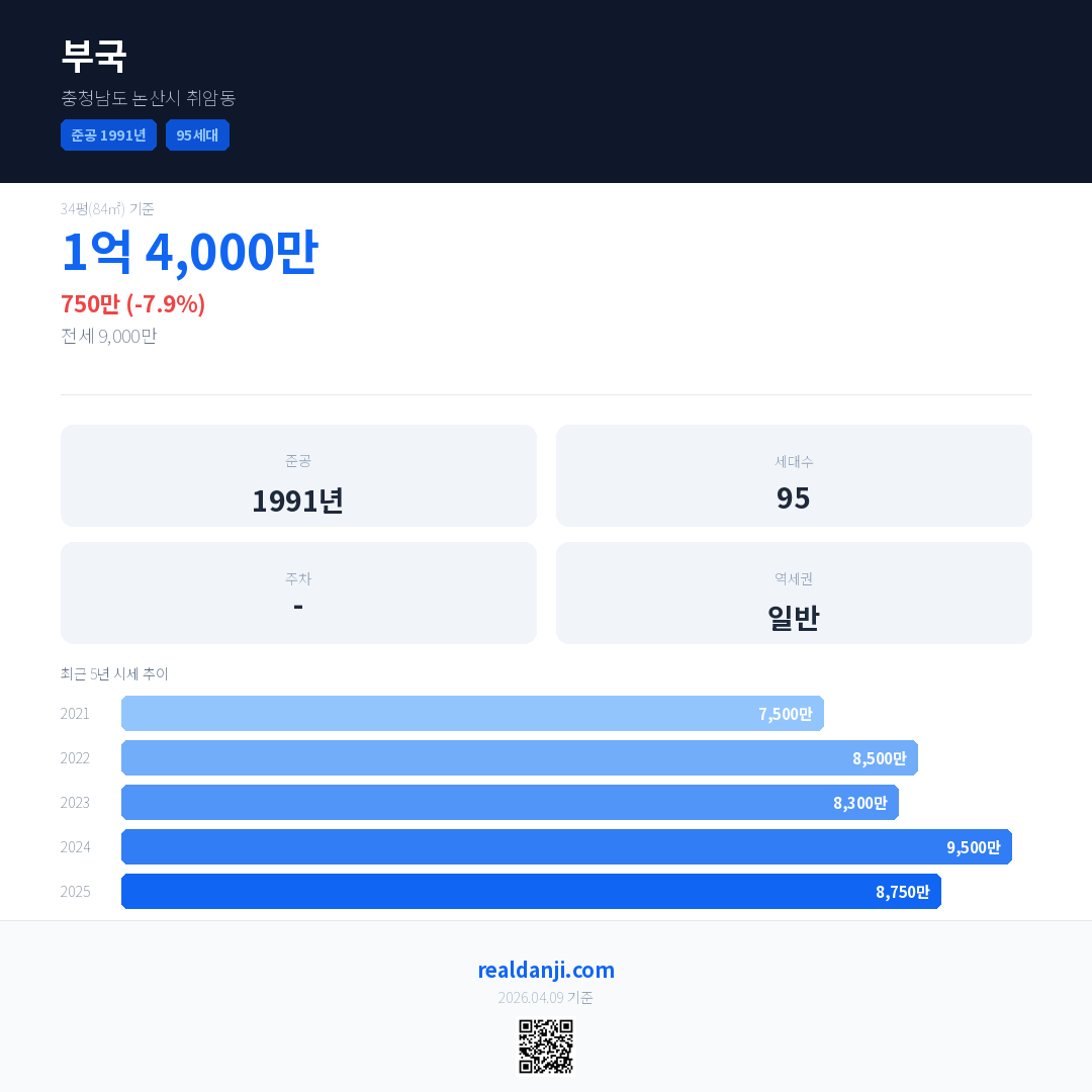 부국 국민평형 기준 2025년 평균 거래가는 8,750만으로, 전년 대비 7.9% 하락 했습니다.