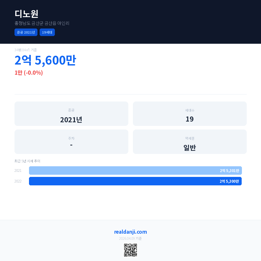 디노원 국민평형 기준 2022년 평균 거래가는 2억 5,300만으로, 전년 대비 0.0% 하락 했습니다.