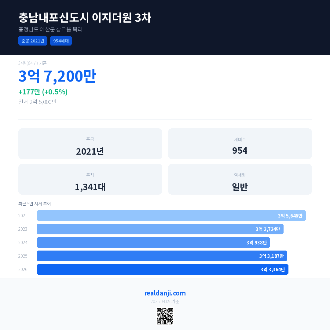 충남내포신도시 이지더원 3차 최근 거래가는 3억 6,500만입니다. (2026-03)