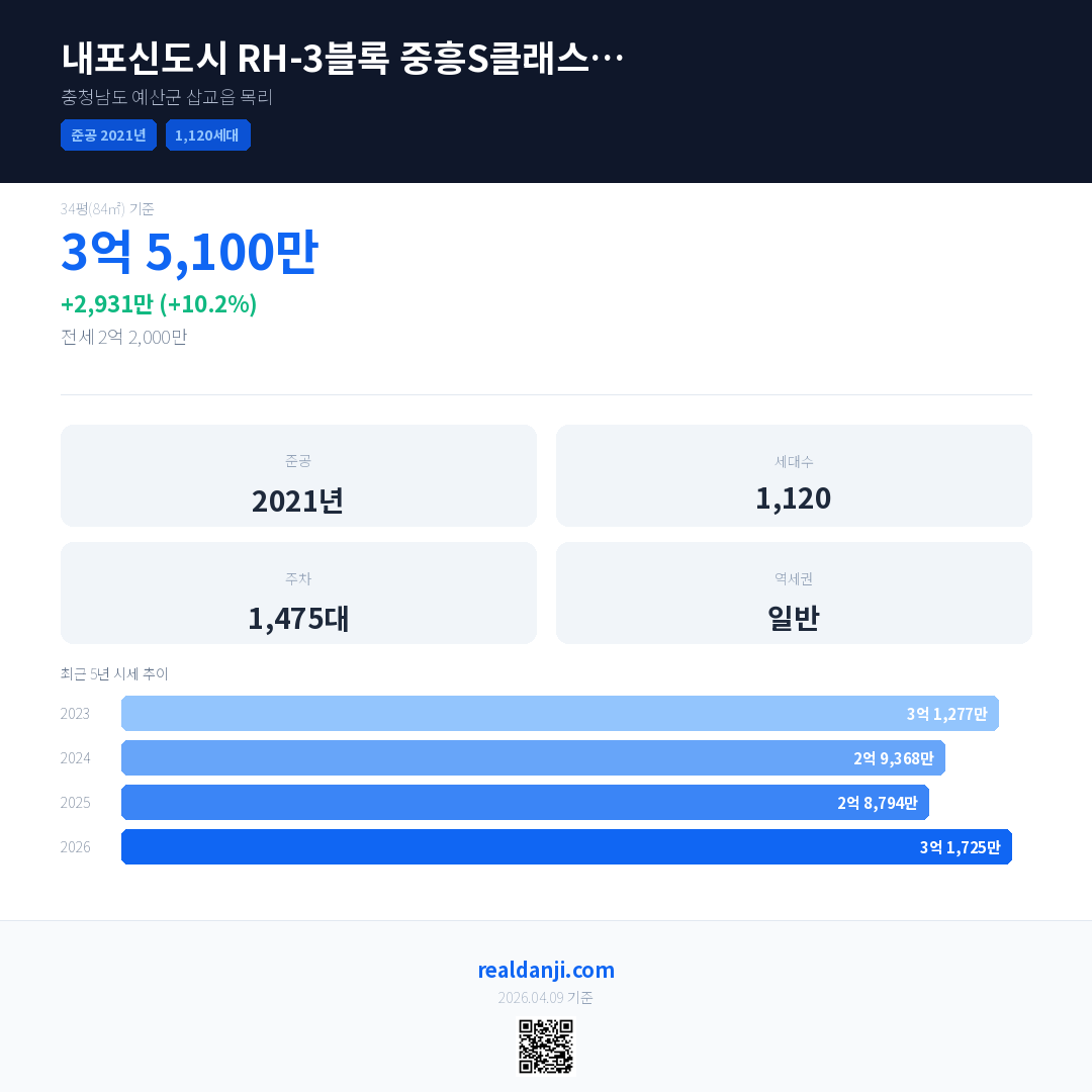 내포신도시 RH-3블록 중흥S클래스 더시티 국민평형 기준 2026년 평균 거래가는 3억 1,725만으로, 전년 대비 10.2% 상승 했습니다.