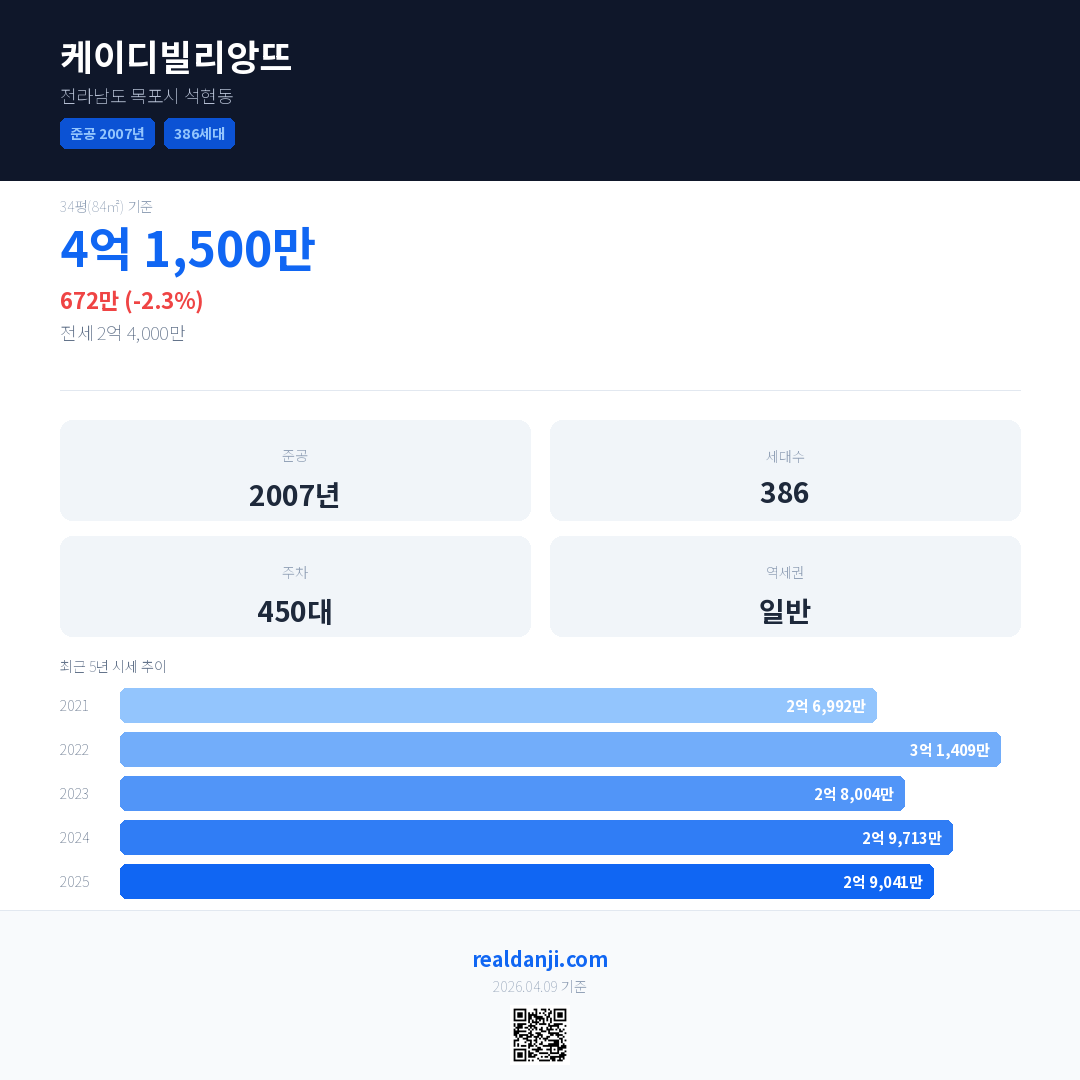 케이디빌리앙뜨 국민평형 기준 2025년 평균 거래가는 2억 9,041만으로, 전년 대비 2.3% 하락 했습니다.