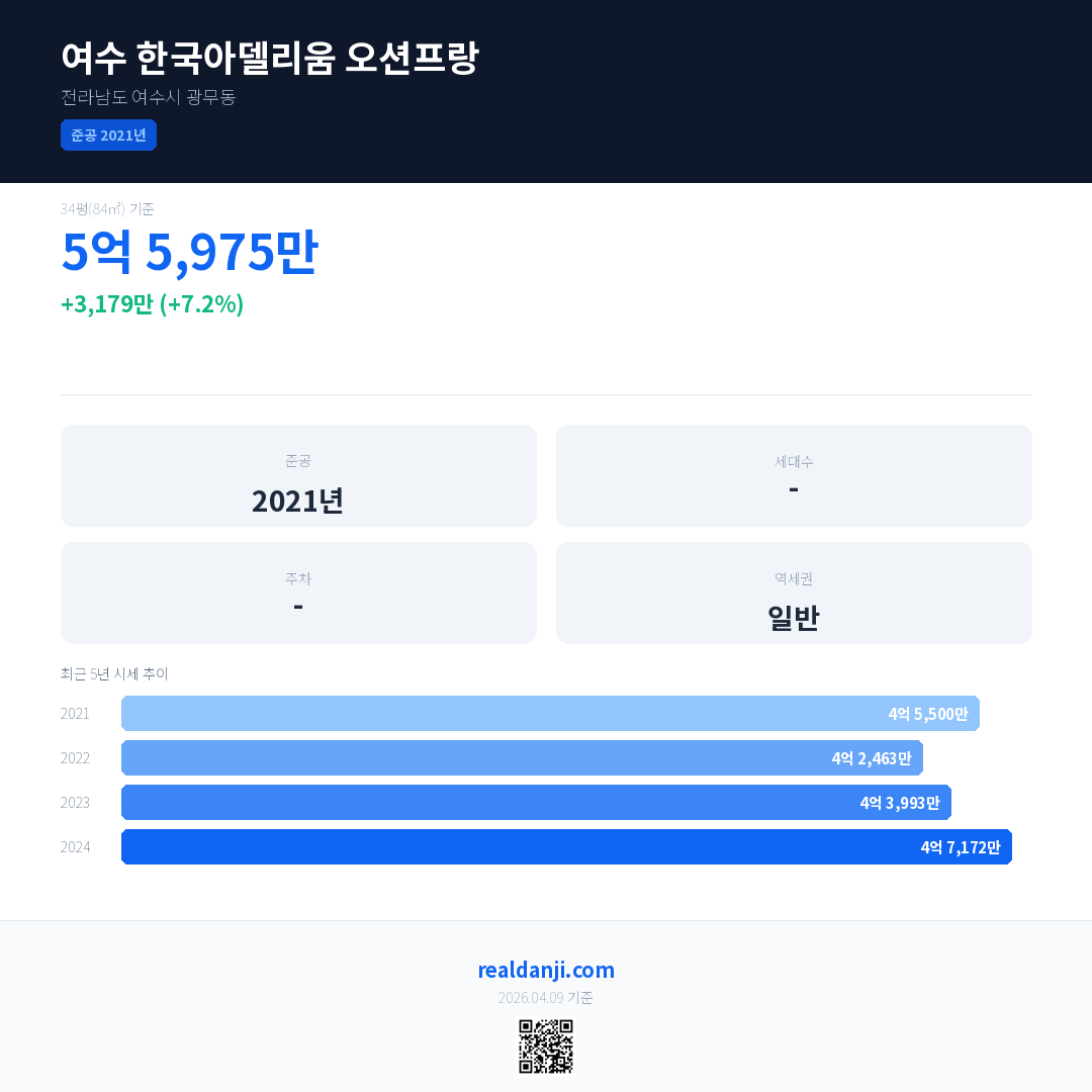 여수 한국아델리움 오션프랑 국민평형 기준 2024년 평균 거래가는 4억 7,172만으로, 전년 대비 7.2% 상승 했습니다.