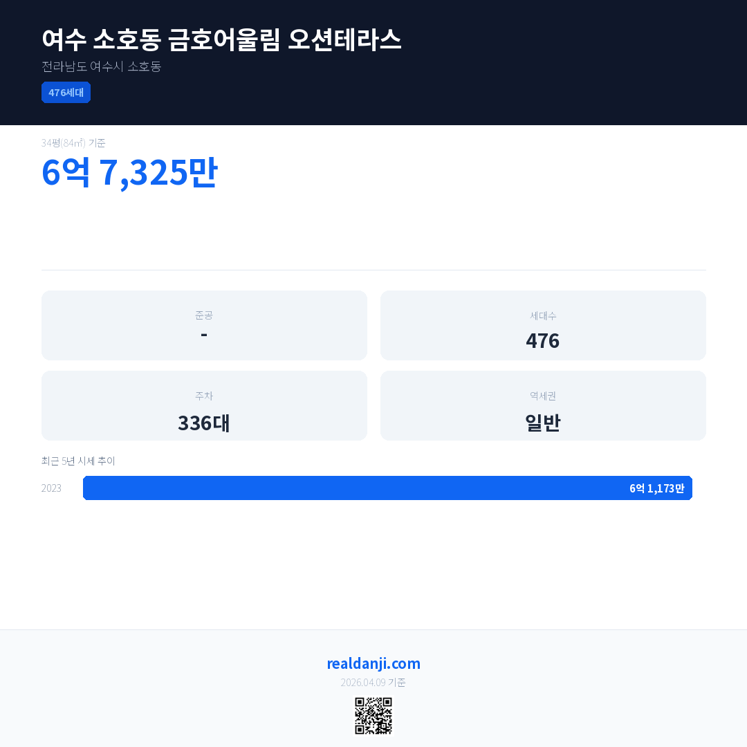 여수 소호동 금호어울림 오션테라스 최근 거래가는 5억 5,020만입니다. (2023-03)