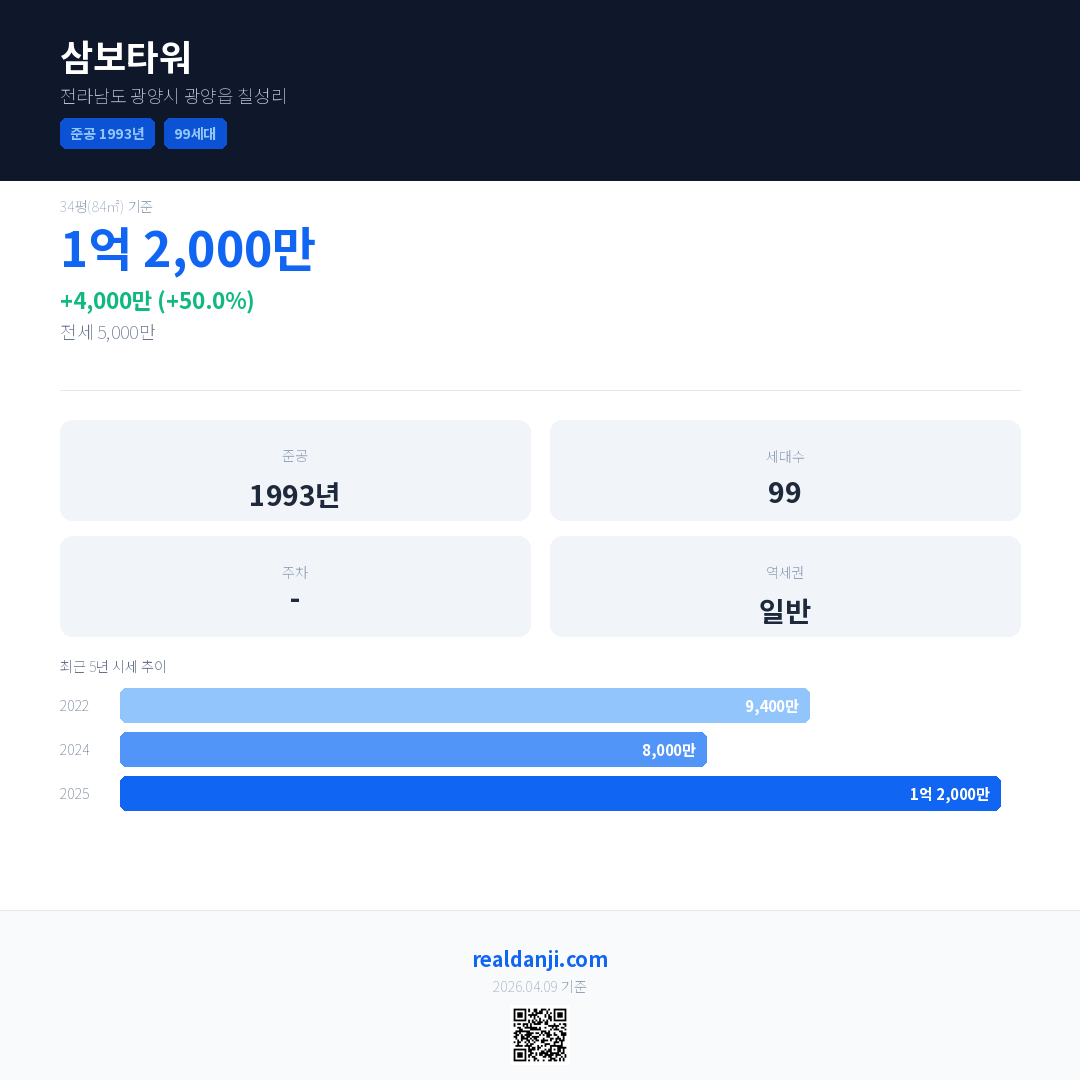 삼보타워 국민평형 기준 2025년 평균 거래가는 1억 2,000만으로, 전년 대비 50.0% 상승 했습니다.