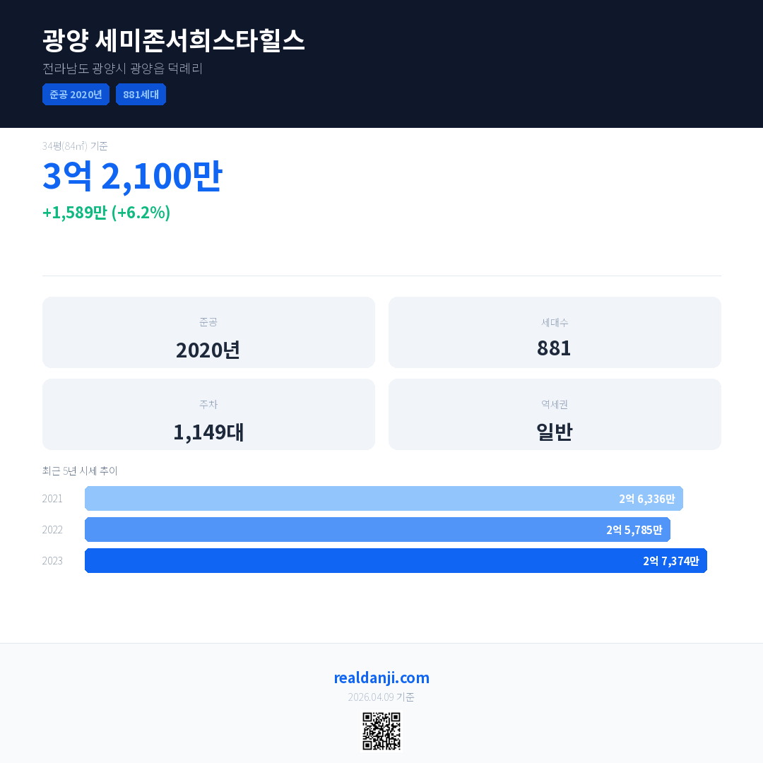 광양 세미존서희스타힐스은(는) 2020년에 준공되었으며, 현재 6년차입니다. 총 881세대 규모입니다.