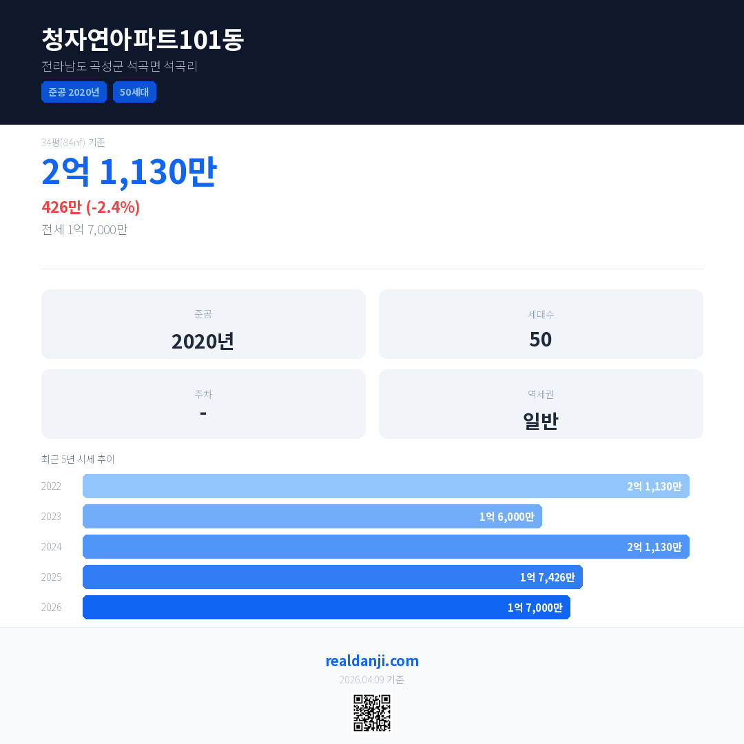 청자연아파트101동 최근 거래가는 1억 7,000만입니다. (2026-03)