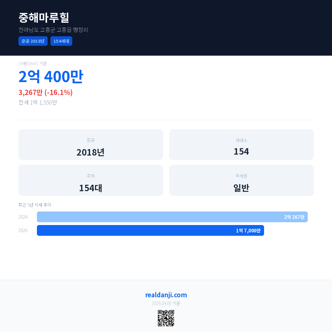 중해마루힐 국민평형 기준 2026년 평균 거래가는 1억 7,000만으로, 전년 대비 16.1% 하락 했습니다.
