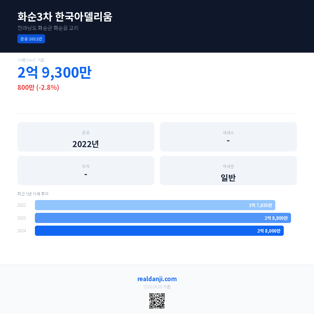 화순3차 한국아델리움 최근 거래가는 2억 9,300만입니다. (2024-01)