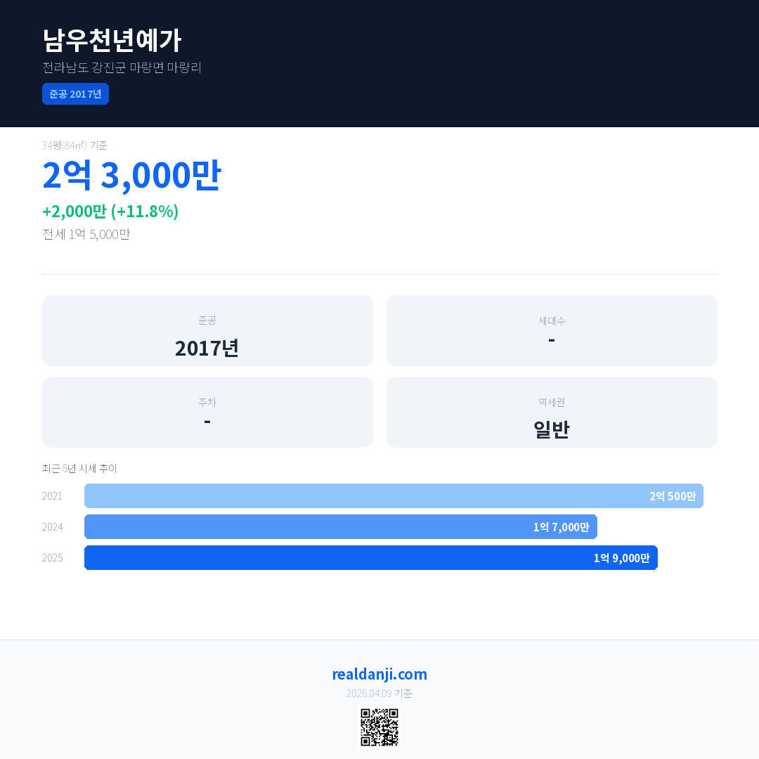 남우천년예가 최근 거래가는 2억 3,000만입니다. (2025-07)