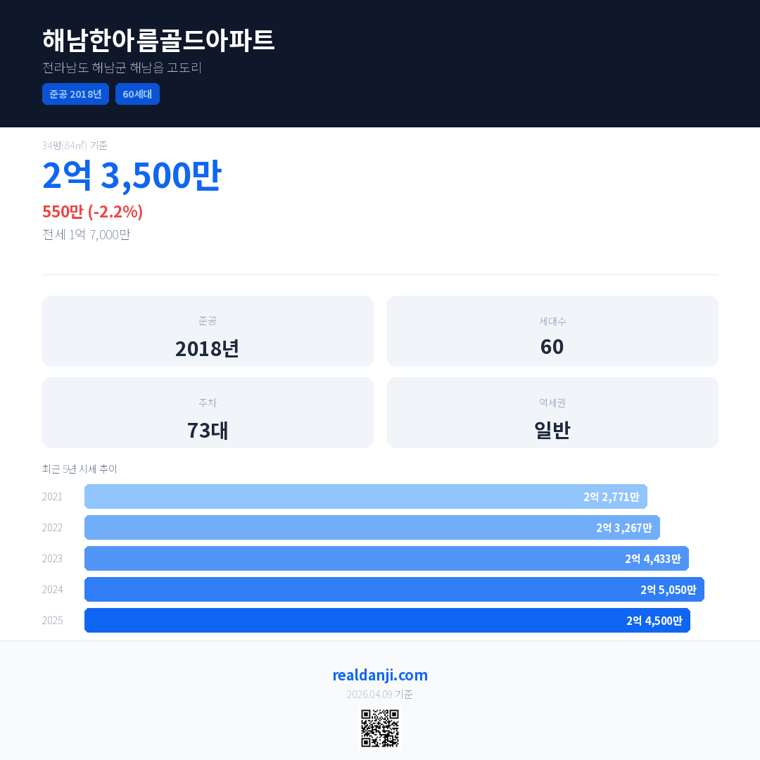 해남한아름골드아파트 국민평형 기준 2025년 평균 거래가는 2억 4,500만으로, 전년 대비 2.2% 하락 했습니다.