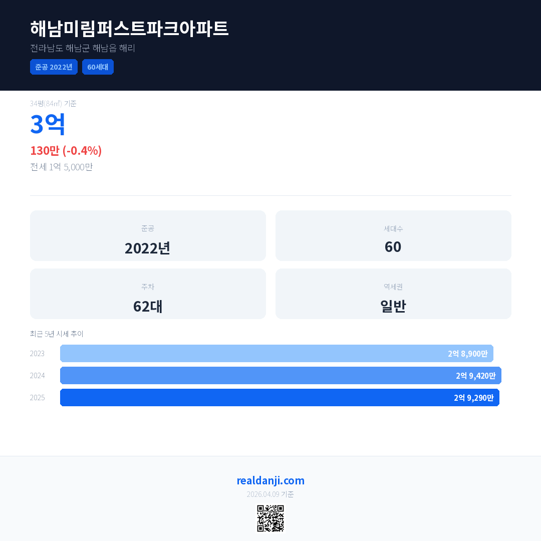 해남미림퍼스트파크아파트 국민평형 기준 2025년 평균 거래가는 2억 9,290만으로, 전년 대비 0.4% 하락 했습니다.