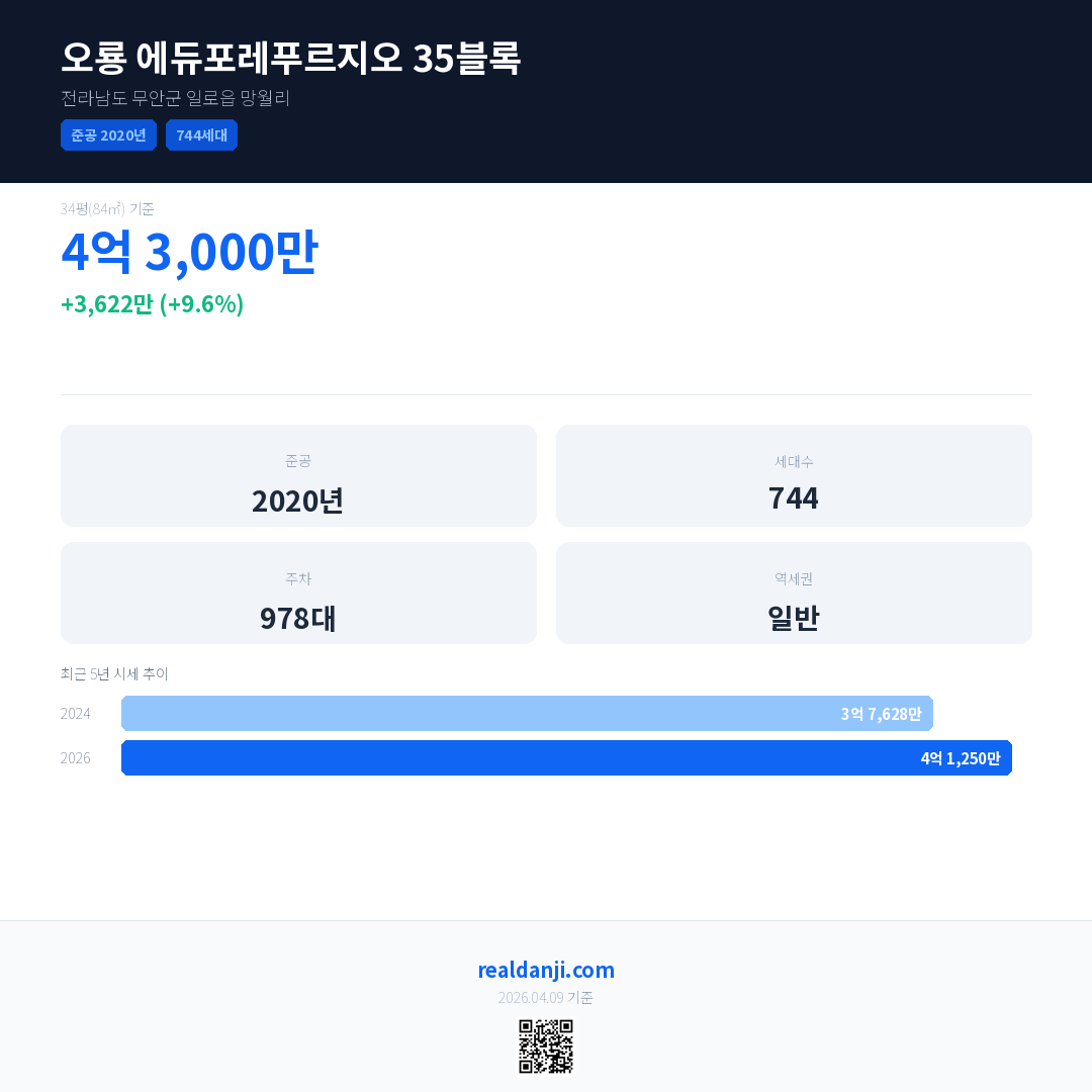 오룡 에듀포레푸르지오 35블록 국민평형 기준 2026년 평균 거래가는 4억 1,250만으로, 전년 대비 9.6% 상승 했습니다.