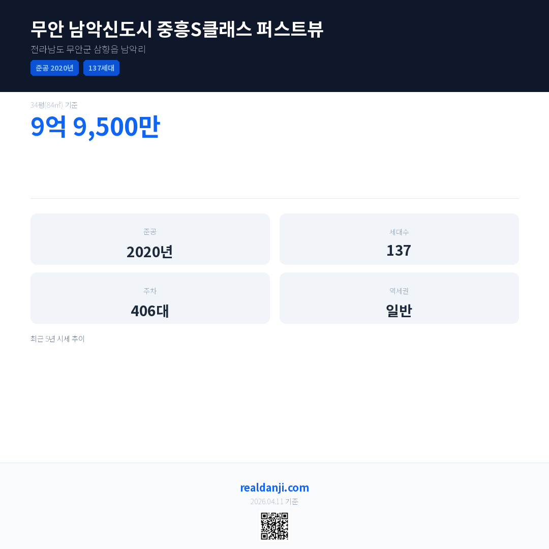 무안 남악신도시 중흥S클래스 퍼스트뷰은(는) 2020년에 준공되었으며, 현재 6년차입니다. 총 137세대 규모입니다.