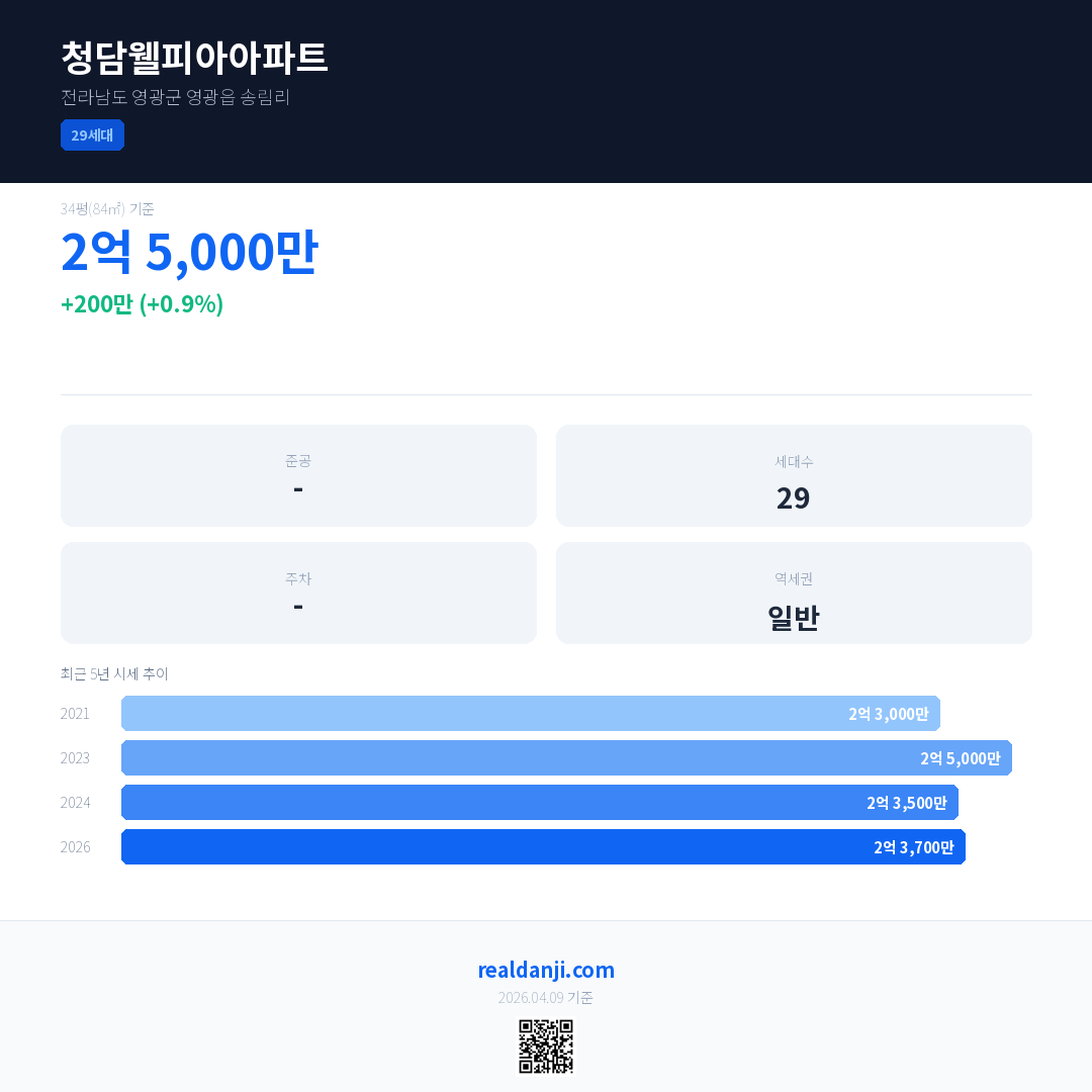 청담웰피아아파트 국민평형 기준 2026년 평균 거래가는 2억 3,700만으로, 전년 대비 0.9% 상승 했습니다.