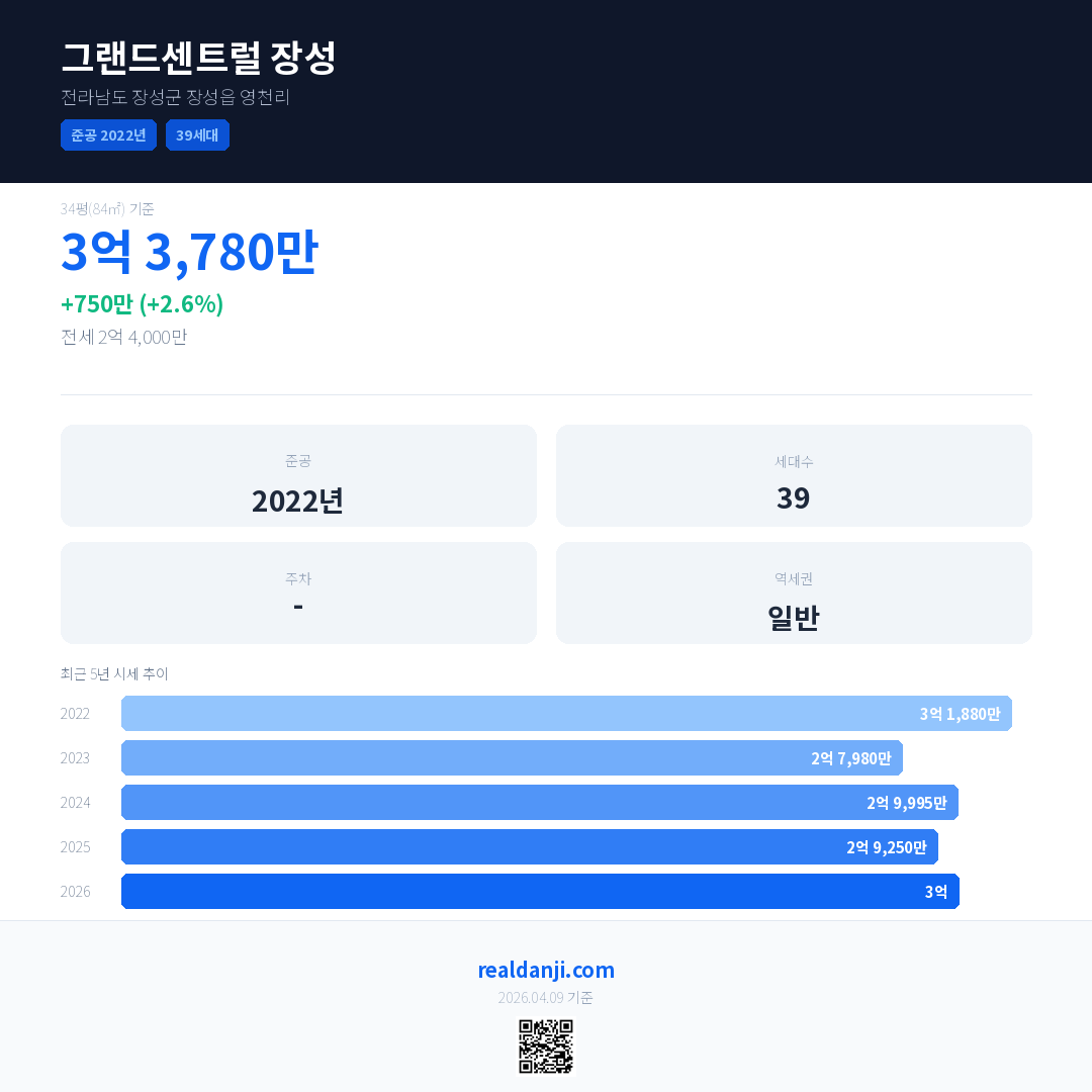 그랜드센트럴 장성 국민평형 기준 2026년 평균 거래가는 3억으로, 전년 대비 2.6% 상승 했습니다.