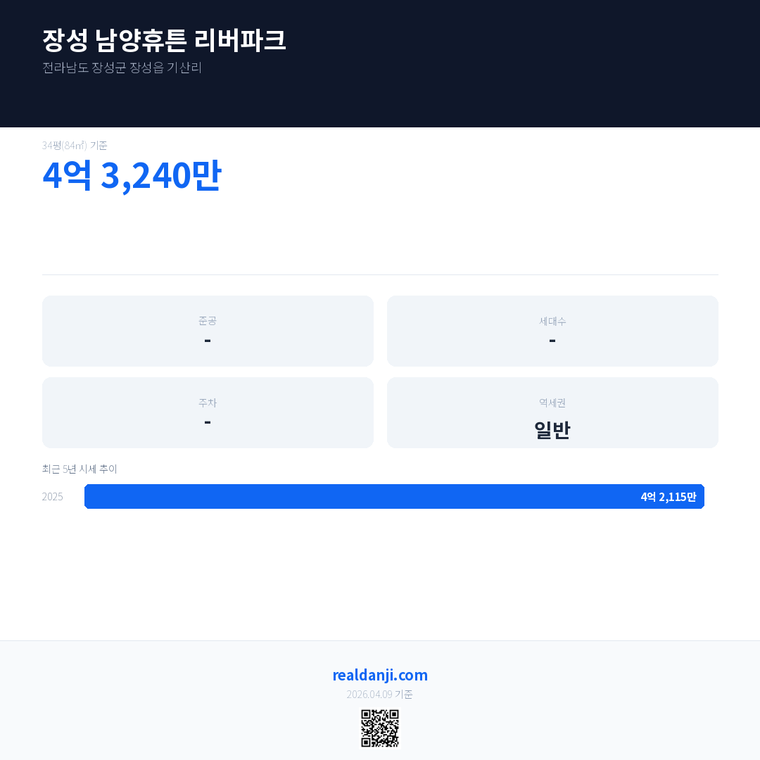 장성 남양휴튼 리버파크 최근 거래가는 4억 3,240만입니다. (2025-05)