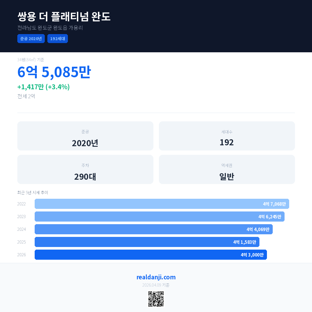 쌍용 더 플래티넘 완도 최근 거래가는 4억 3,000만입니다. (2026-03)