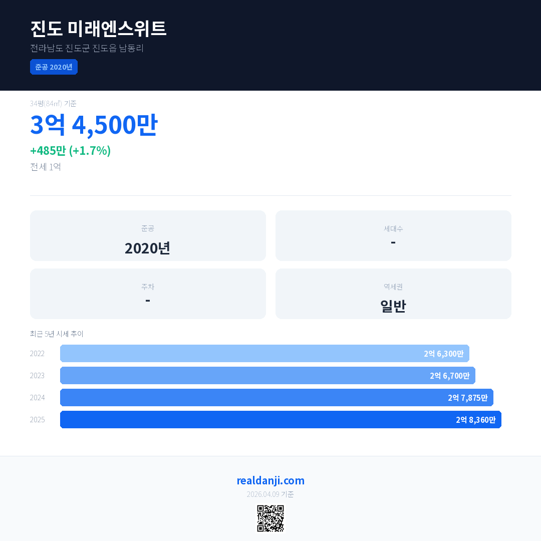 진도 미래엔스위트 국민평형 기준 2025년 평균 거래가는 2억 8,360만으로, 전년 대비 1.7% 상승 했습니다.