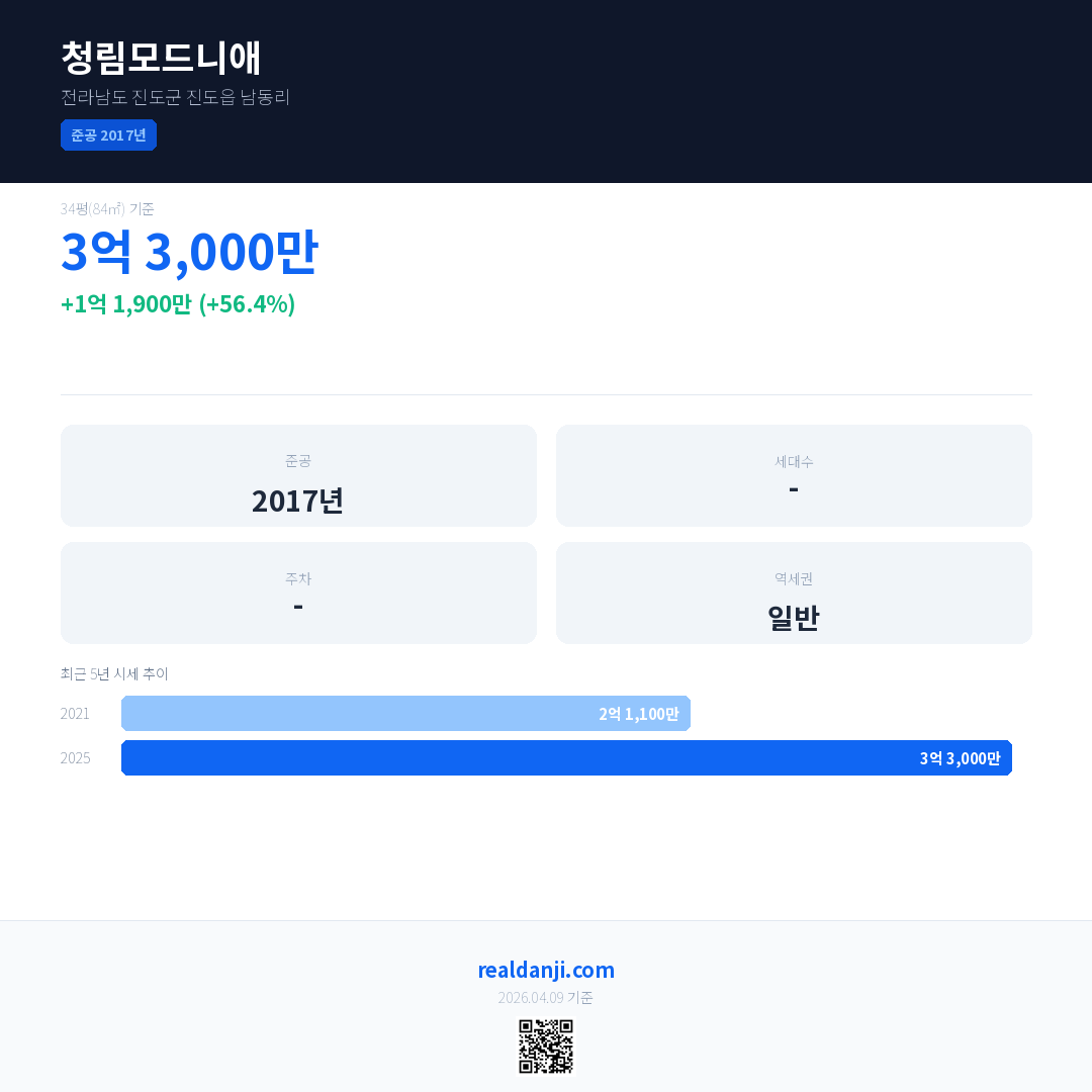 청림모드니애은(는) 2017년에 준공되었으며, 현재 9년차입니다.