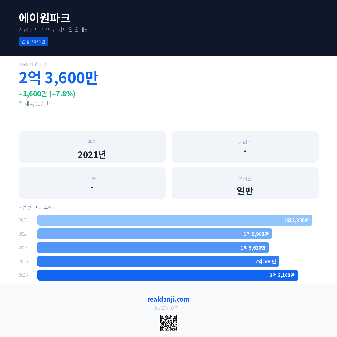에이원파크 국민평형 기준 2026년 평균 거래가는 2억 2,100만으로, 전년 대비 7.8% 상승 했습니다.
