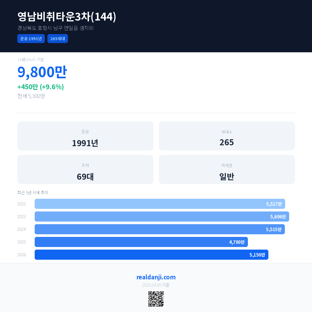 영남비취타운3차(144) 최근 거래가는 9,800만입니다. (2026-03)