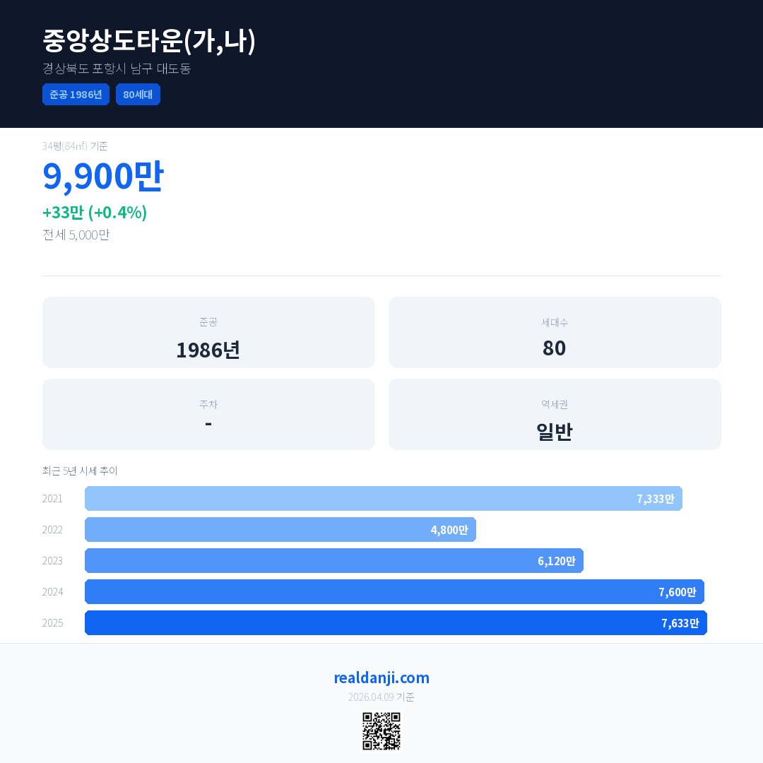 중앙상도타운(가,나) 국민평형 기준 2025년 평균 거래가는 7,633만으로, 전년 대비 0.4% 상승 했습니다.