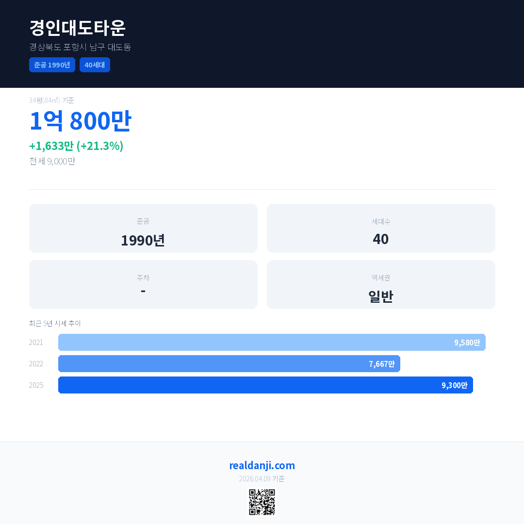 경인대도타운 국민평형 기준 2025년 평균 거래가는 9,300만으로, 전년 대비 21.3% 상승 했습니다.