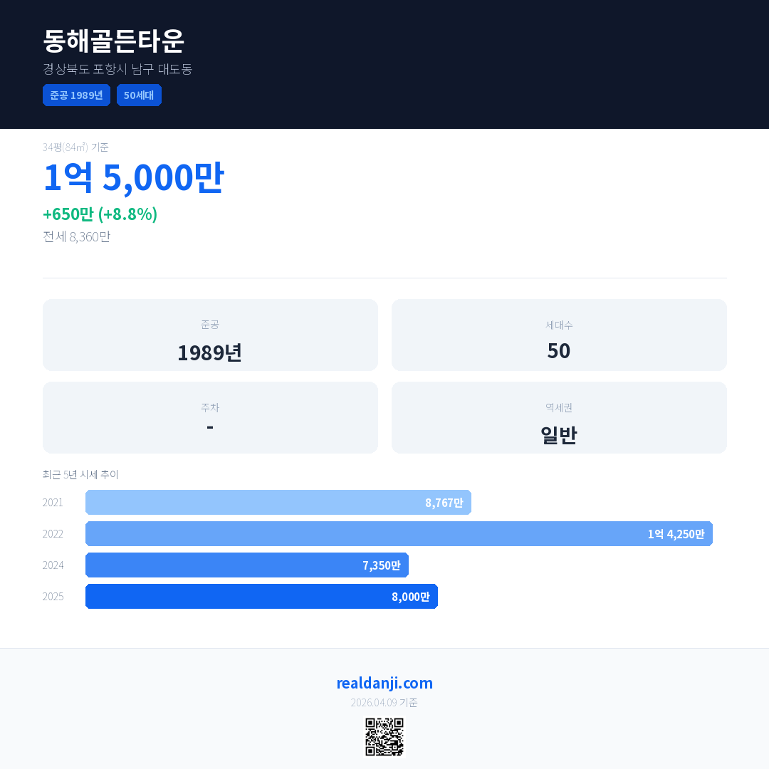 동해골든타운 국민평형 기준 2025년 평균 거래가는 8,000만으로, 전년 대비 8.8% 상승 했습니다.