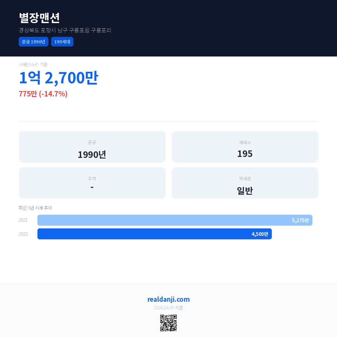 별장맨션 국민평형 기준 2025년 평균 거래가는 4,500만으로, 전년 대비 14.7% 하락 했습니다.