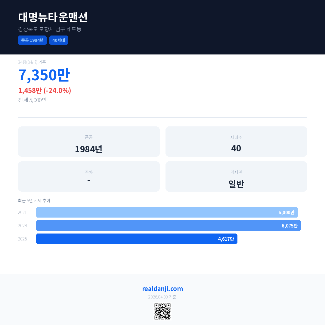 대명뉴타운맨션 최근 거래가는 7,350만입니다. (2025-12)
