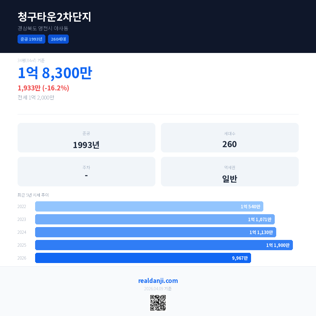 청구타운2차단지 최근 거래가는 1억 8,300만입니다. (2026-04)