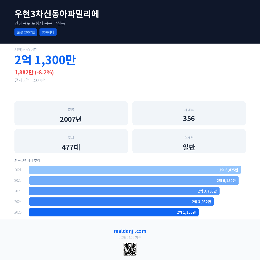우현3차신동아파밀리에 국민평형 기준 2025년 평균 거래가는 2억 1,150만으로, 전년 대비 8.2% 하락 했습니다.