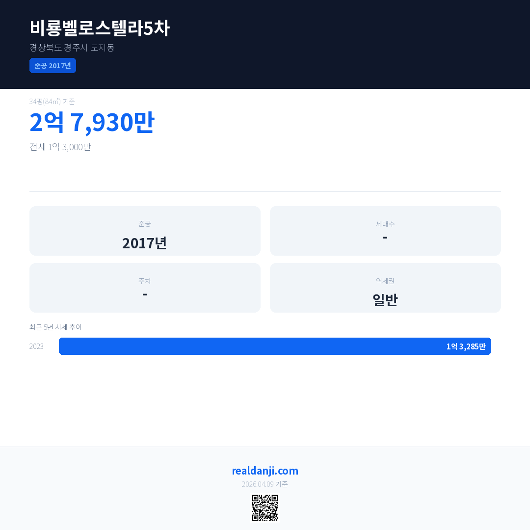 비룡벨로스텔라5차 국민평형 기준 2023년 평균 거래가는 1억 3,285만으로, 전년 대비 51.3% 하락 했습니다.