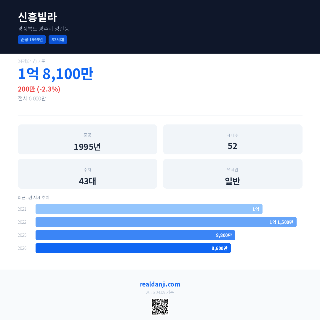 신흥빌라 국민평형 기준 2026년 평균 거래가는 8,600만으로, 전년 대비 2.3% 하락 했습니다.