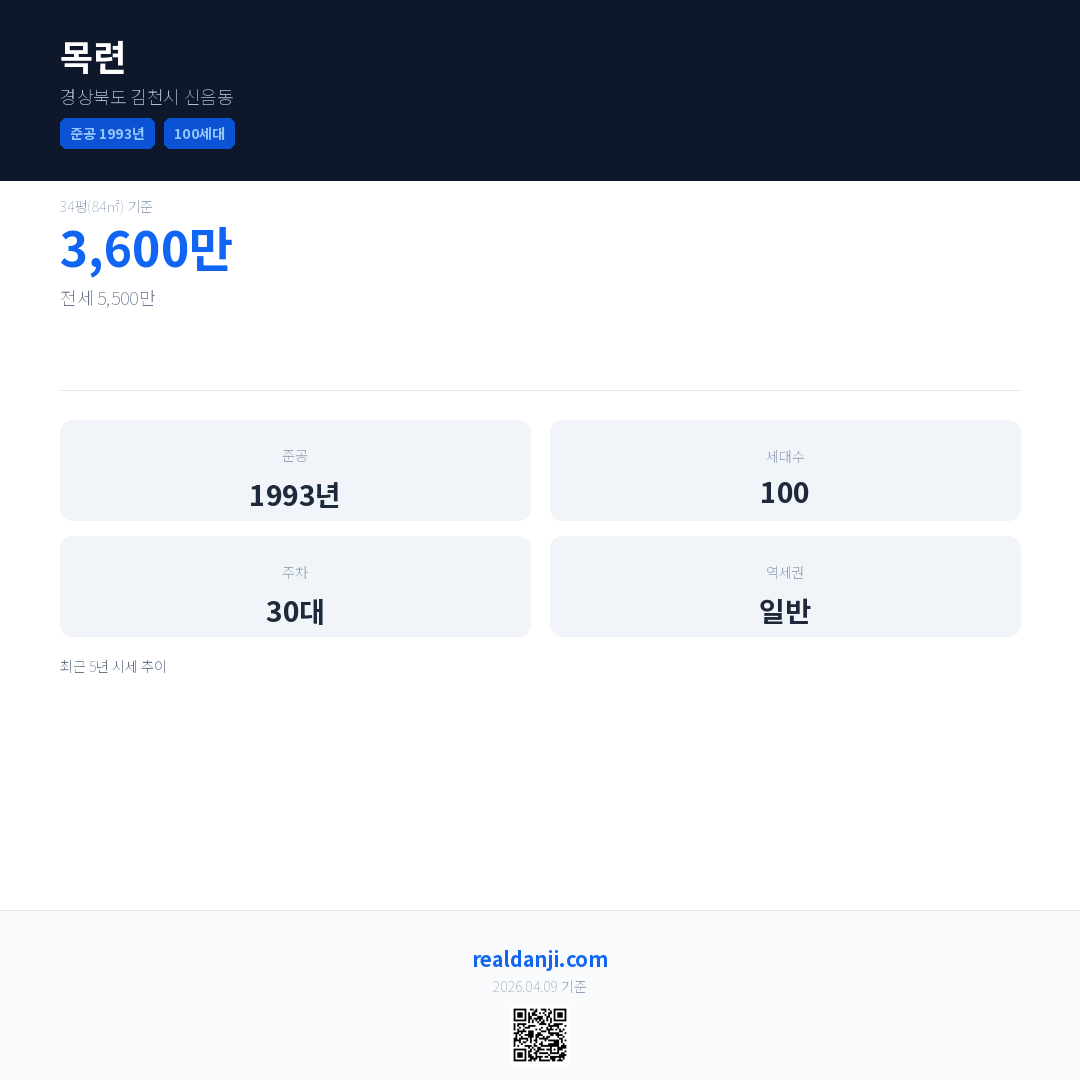목련은(는) 1993년에 준공되었으며, 현재 33년차입니다. 총 100세대 규모입니다.
