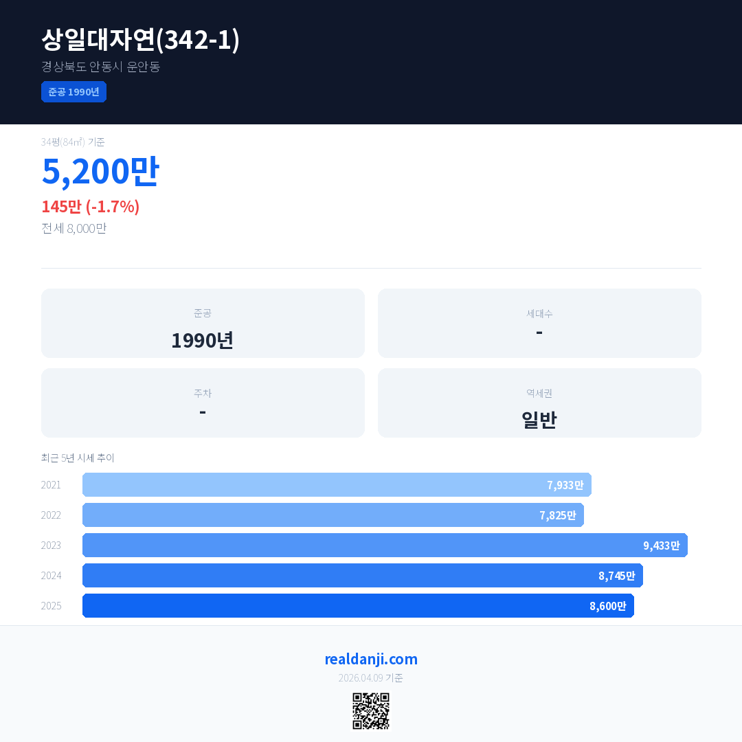 상일대자연(342-1) 국민평형 기준 2025년 평균 거래가는 8,600만으로, 전년 대비 1.7% 하락 했습니다.