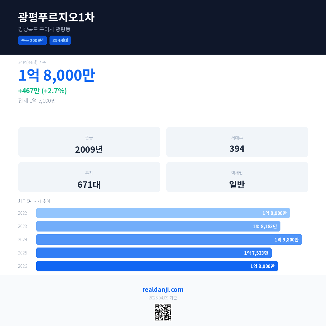 광평푸르지오1차 국민평형 기준 2026년 평균 거래가는 1억 8,000만으로, 전년 대비 2.7% 상승 했습니다.