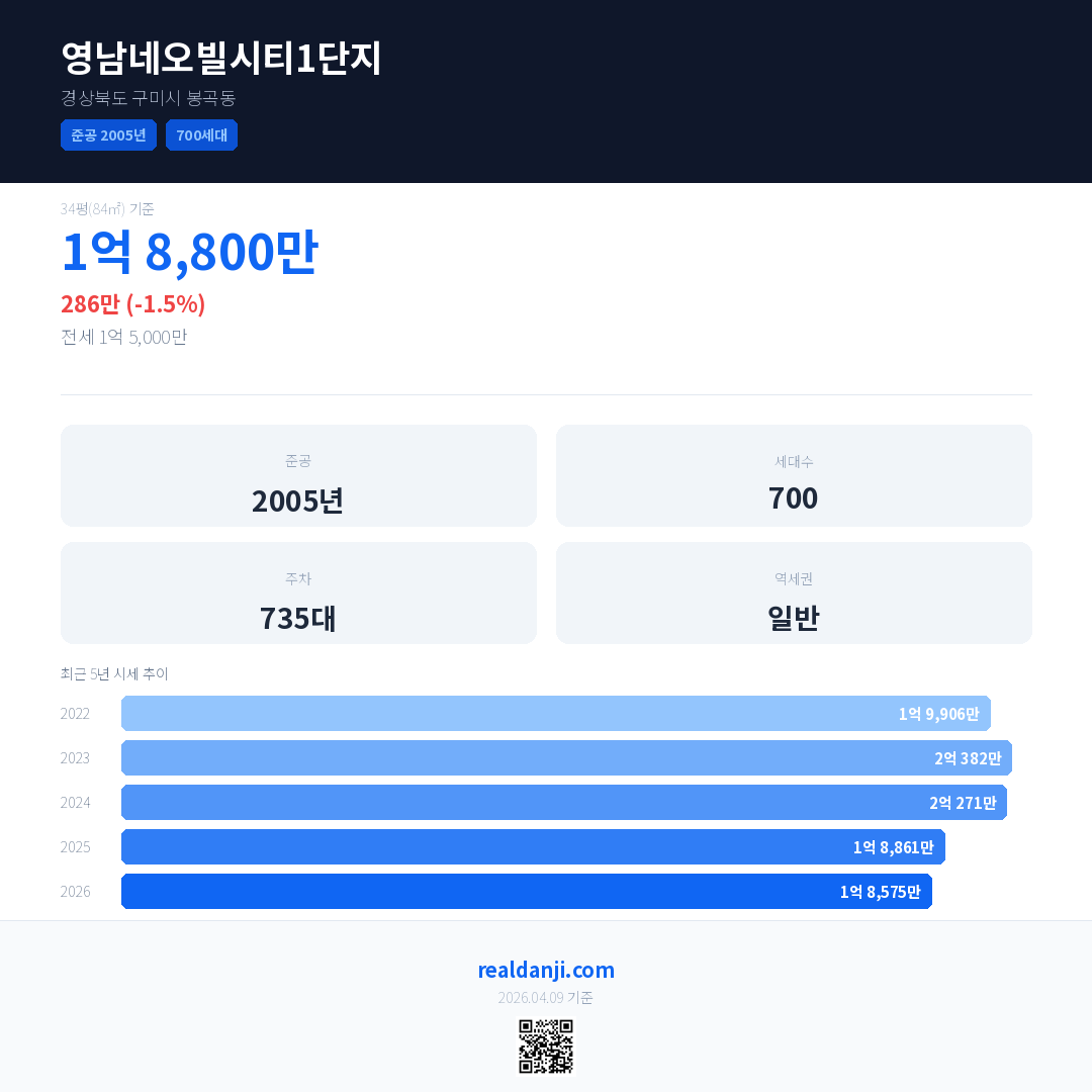 영남네오빌시티1단지 국민평형 기준 2026년 평균 거래가는 1억 8,575만으로, 전년 대비 1.5% 하락 했습니다.