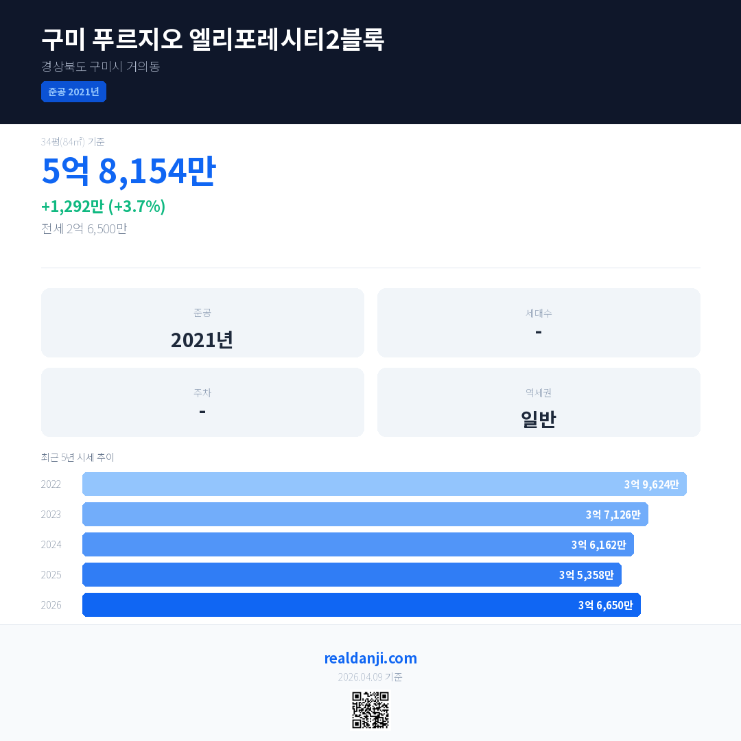 구미 푸르지오 엘리포레시티2블록 국민평형 기준 2026년 평균 거래가는 3억 6,650만으로, 전년 대비 3.7% 상승 했습니다.