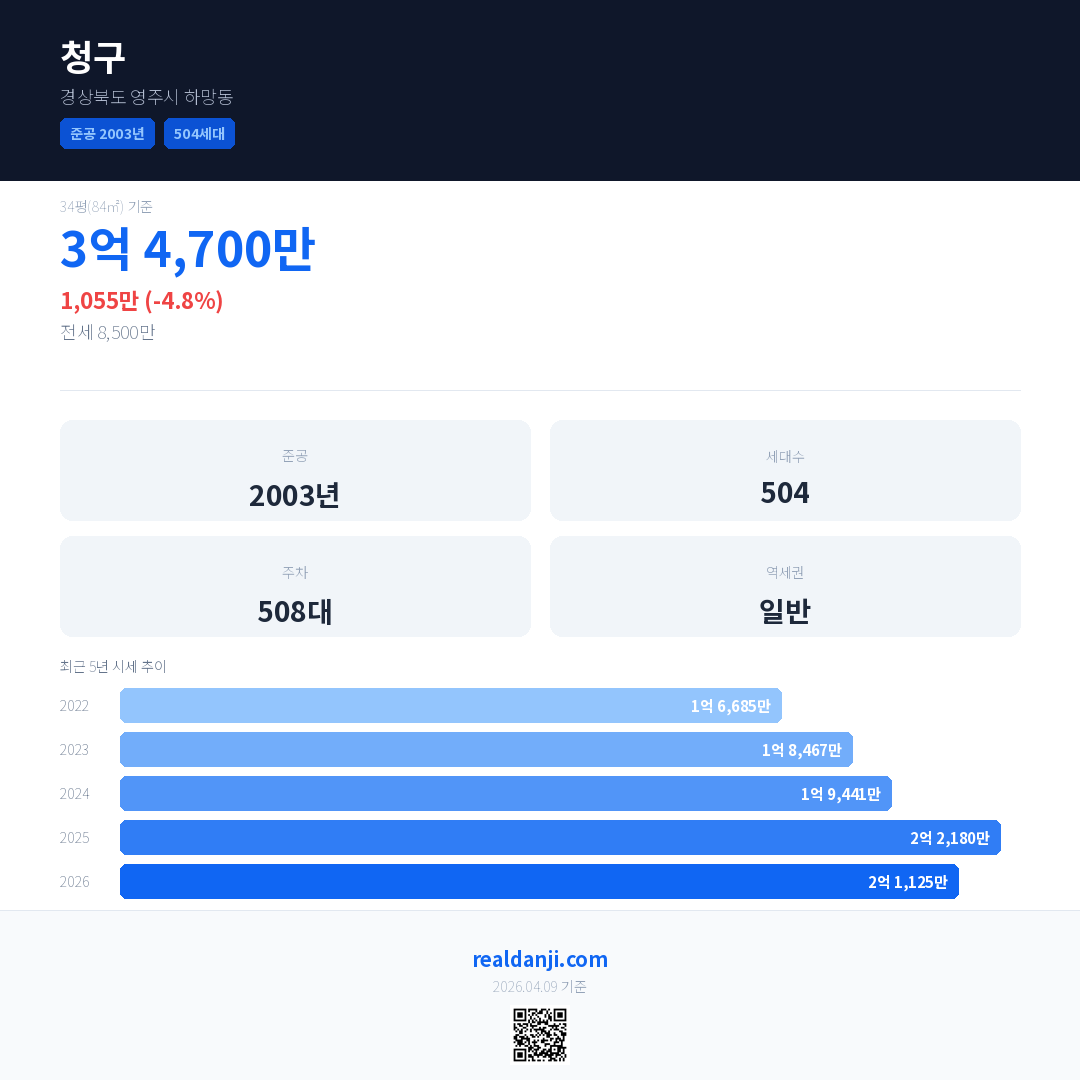 청구 국민평형 기준 2026년 평균 거래가는 2억 1,125만으로, 전년 대비 4.8% 하락 했습니다.
