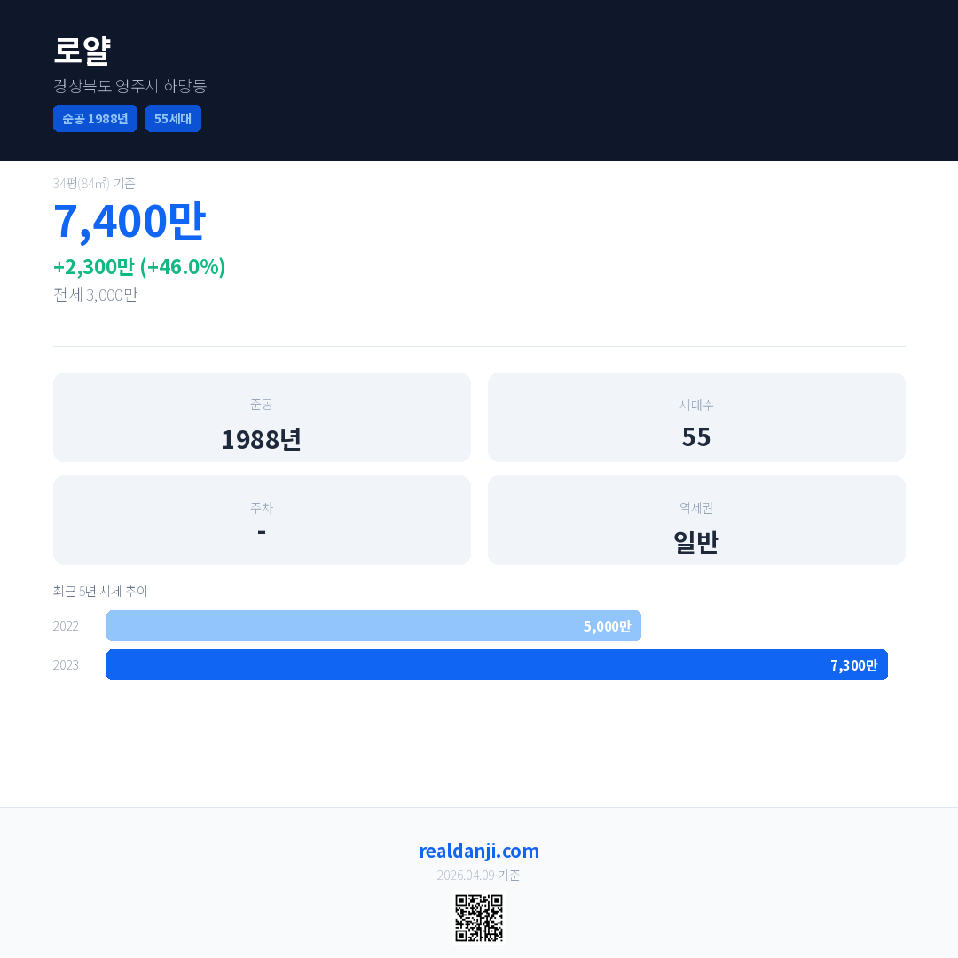 로얄 국민평형 기준 2023년 평균 거래가는 7,300만으로, 전년 대비 46.0% 상승 했습니다.