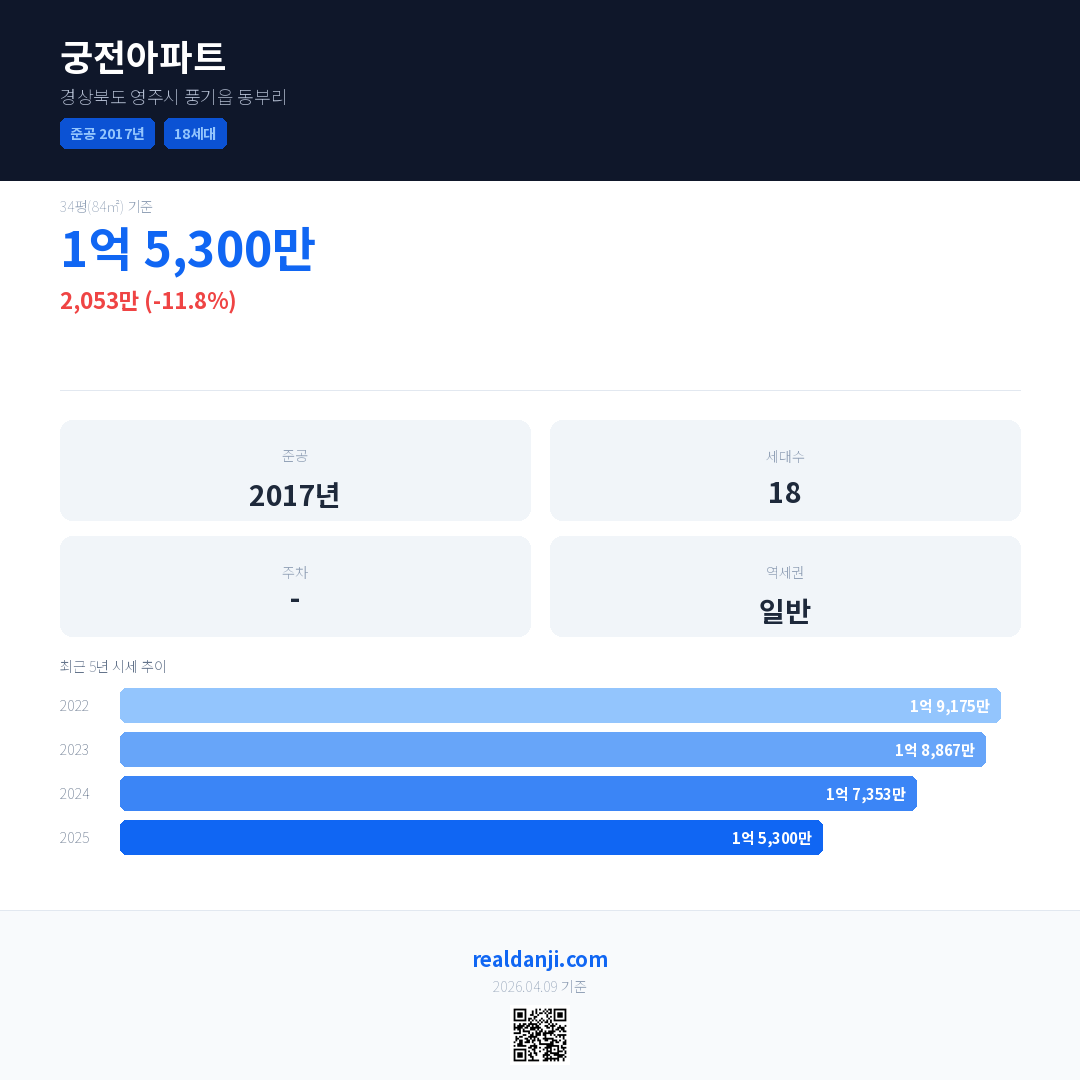 궁전아파트 국민평형 기준 2025년 평균 거래가는 1억 5,300만으로, 전년 대비 11.8% 하락 했습니다.