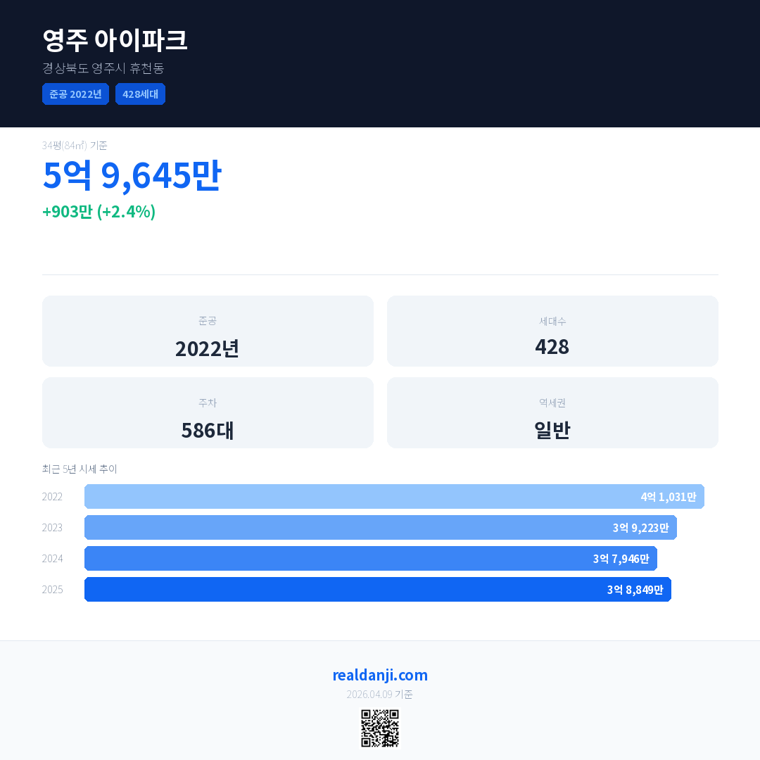 영주 아이파크 최근 거래가는 5억 9,645만입니다. (2026-01)