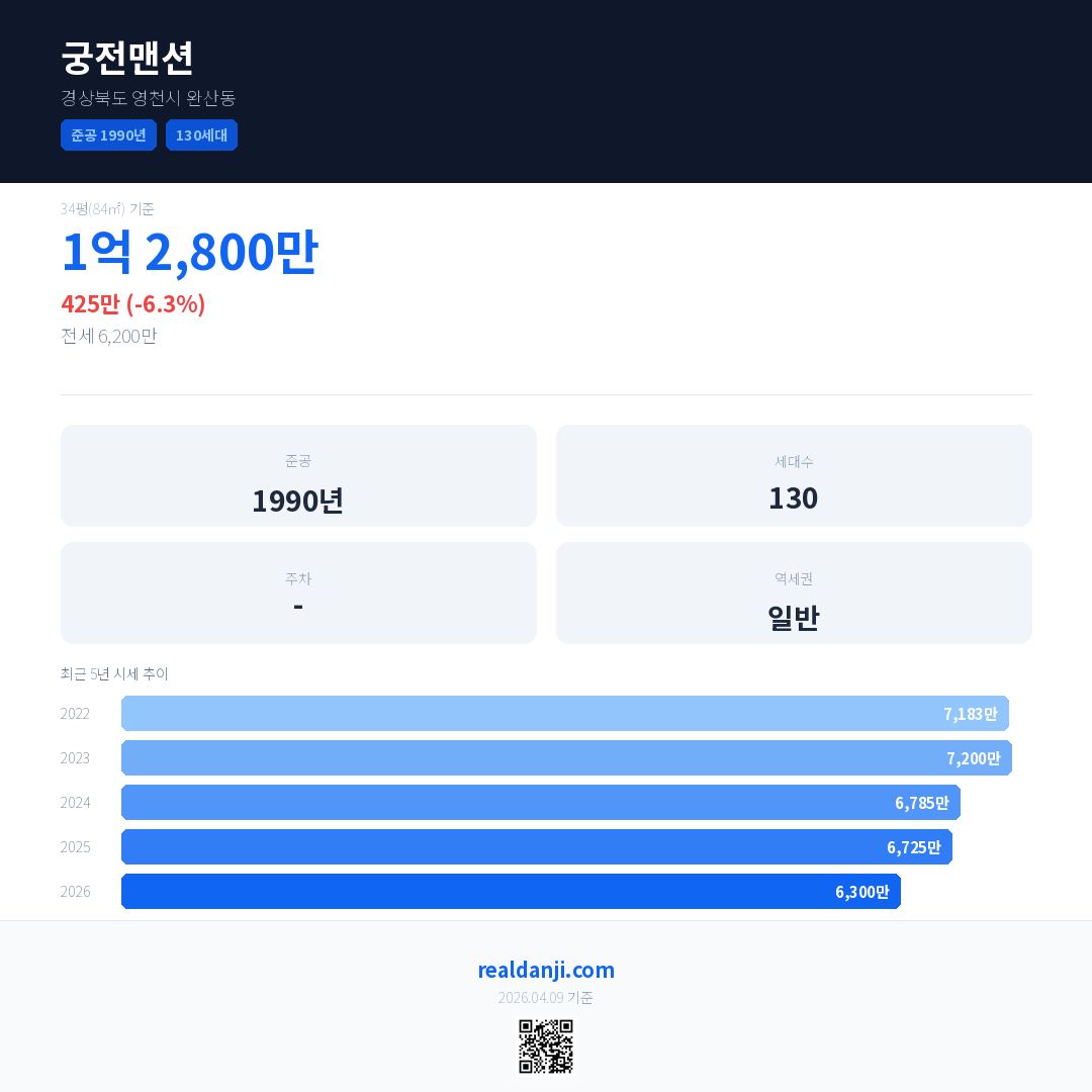 궁전맨션 국민평형 기준 2026년 평균 거래가는 6,300만으로, 전년 대비 6.3% 하락 했습니다.