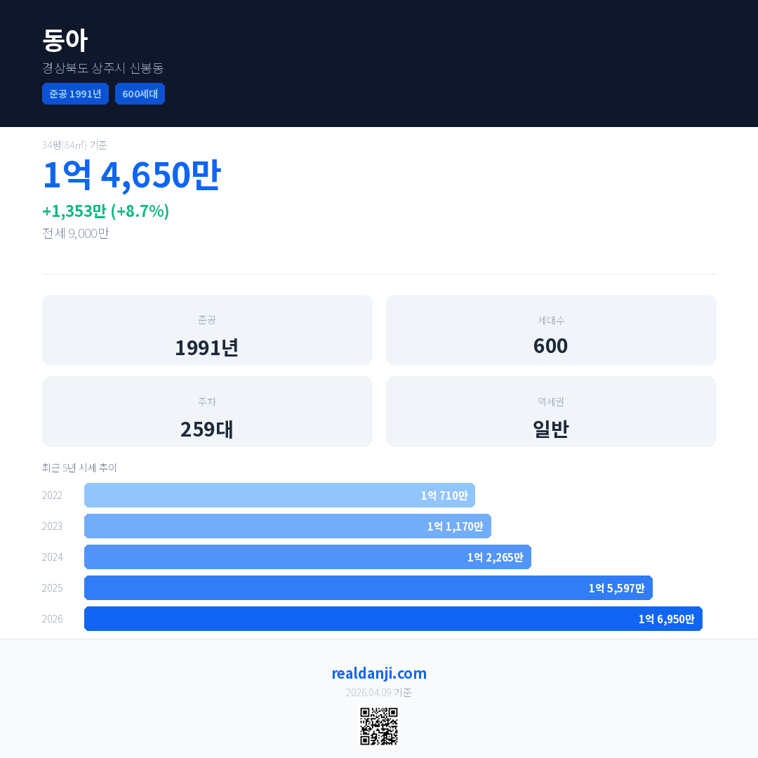 동아 국민평형 기준 2026년 평균 거래가는 1억 6,950만으로, 전년 대비 8.7% 상승 했습니다.