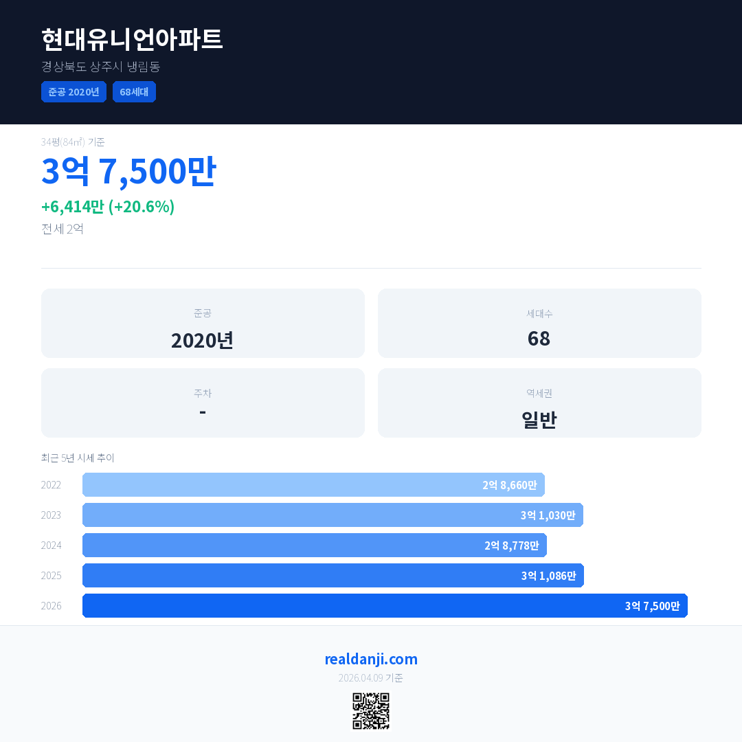 현대유니언아파트 국민평형 기준 2026년 평균 거래가는 3억 7,500만으로, 전년 대비 20.6% 상승 했습니다.