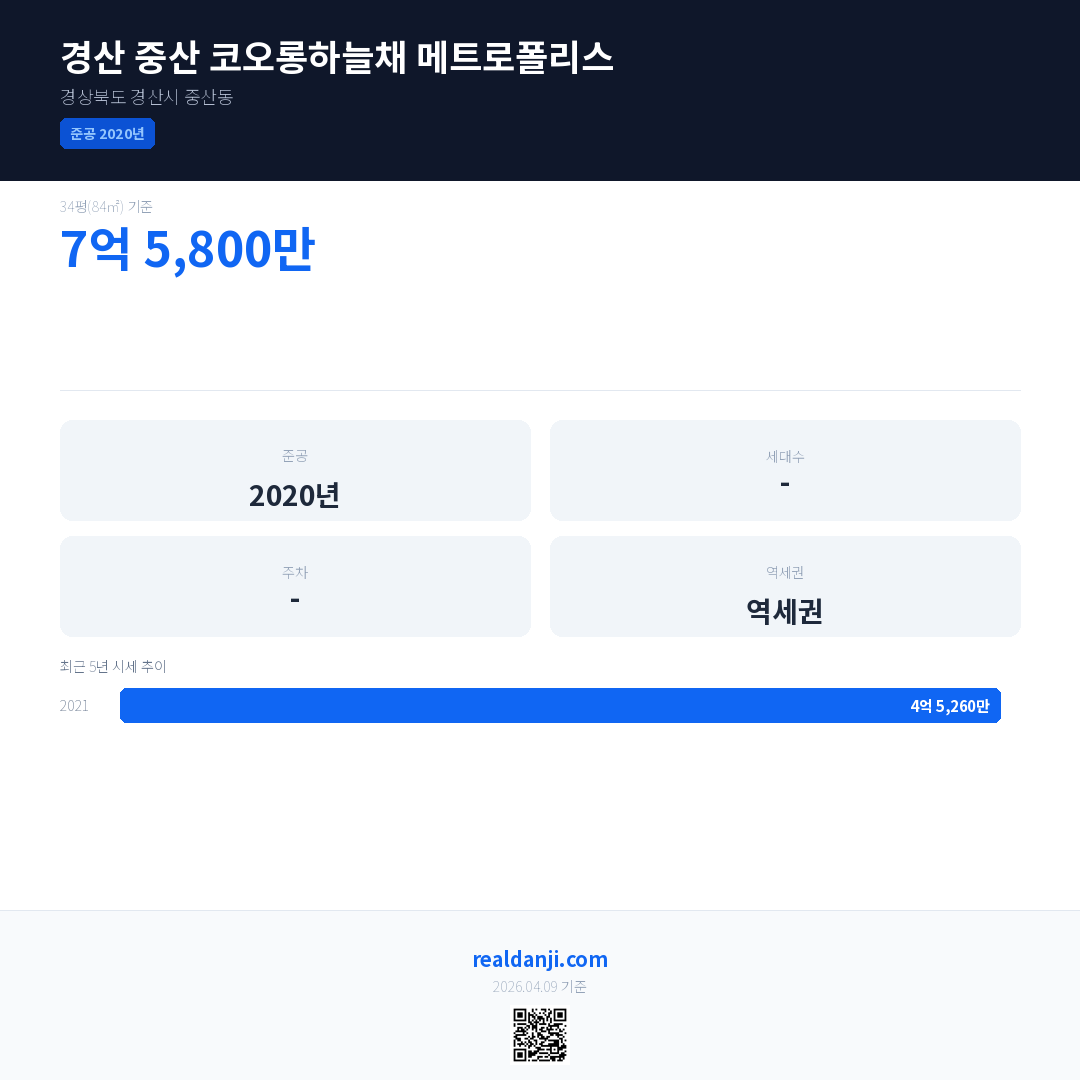 경산 중산 코오롱하늘채 메트로폴리스은(는) 2020년에 준공되었으며, 현재 6년차입니다.