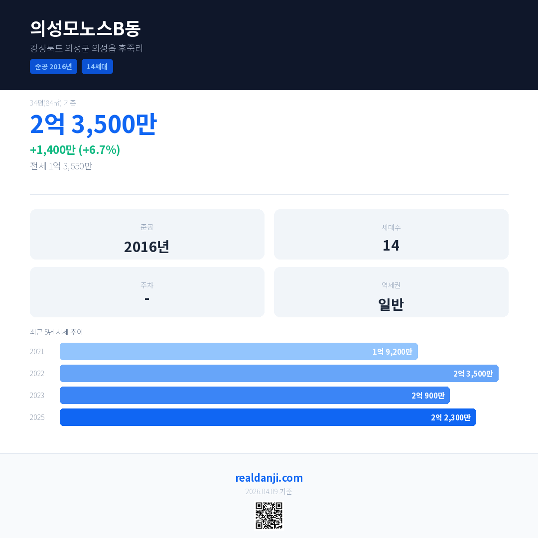 의성모노스B동 국민평형 기준 2025년 평균 거래가는 2억 2,300만으로, 전년 대비 6.7% 상승 했습니다.