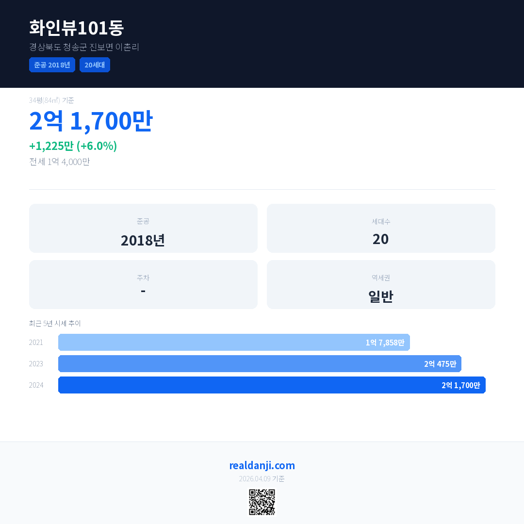 화인뷰101동 국민평형 기준 2024년 평균 거래가는 2억 1,700만으로, 전년 대비 6.0% 상승 했습니다.