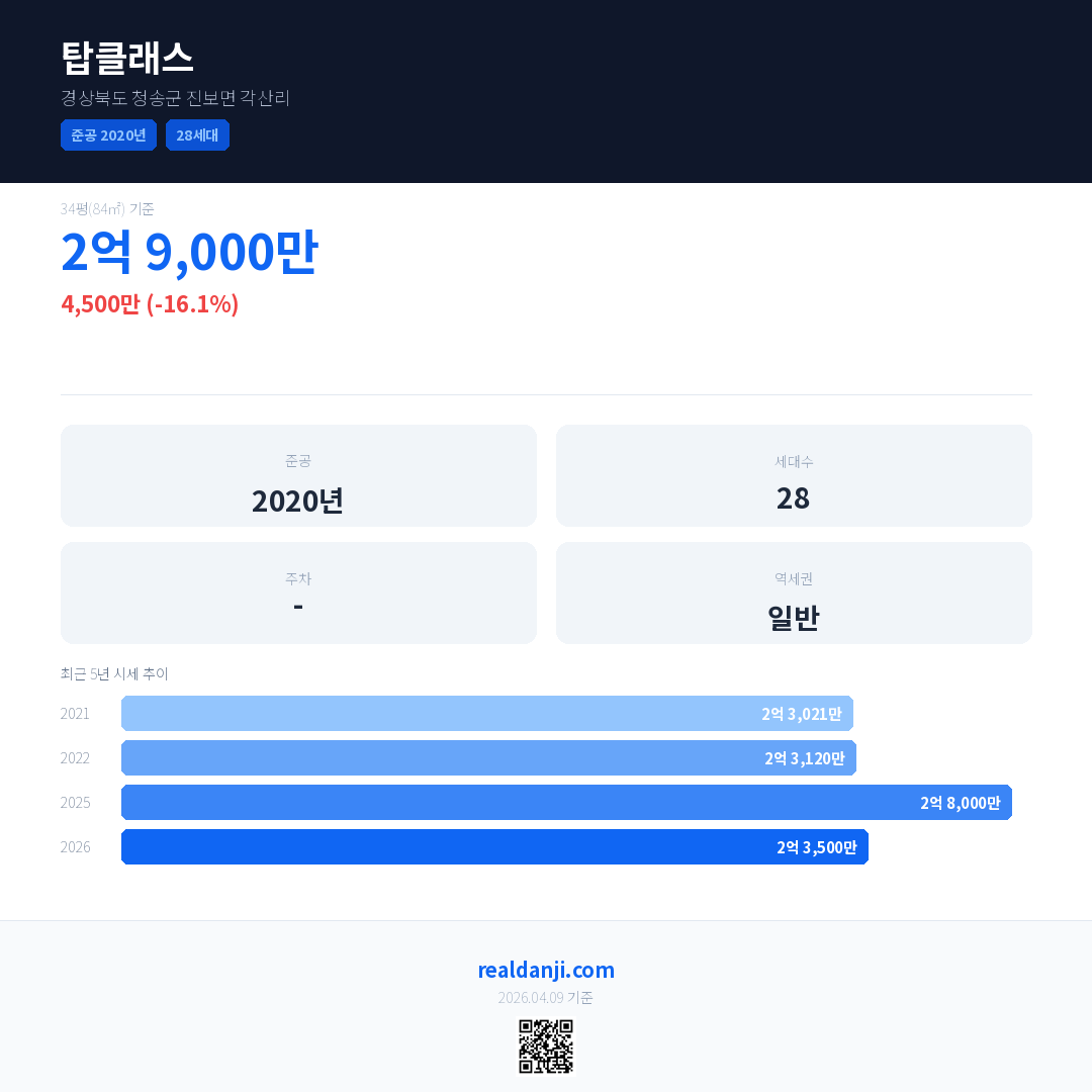 탑클래스 국민평형 기준 2026년 평균 거래가는 2억 3,500만으로, 전년 대비 16.1% 하락 했습니다.